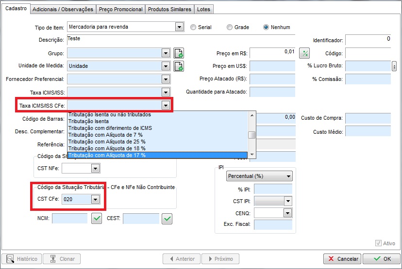 No campo Taxa ICMS/ISS CFe localize a taxa desejada configurada anteriormente, juntamente com o CST 020