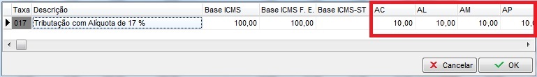 Localize o campo onde contém a alíquota dos respectivos estados.