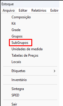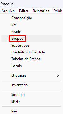 Após clicar no módulo, clique em Arquivo - SubGrupos.