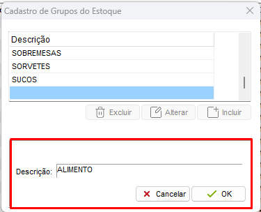 Digite o nome do grupo que necessita, por exemplo: Alimento, para determinar que certo grupo de itens no estoque serão alimentos.