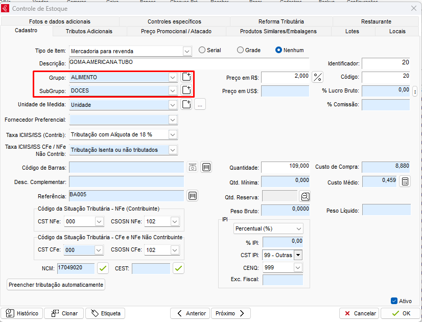 Em seguida, clique duas vezes no item que deseja e localize os campos Grupo e Subgrupo, defina os dados cadastrados anteriormente.
