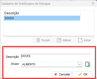 Digite o nome do Subgrupo que necessita, por exemplo: Doces. Lembrando que terá que informar o Grupo ao qual esse SubGrupo pertence, no caso do exemplo, o Grupo seria Alimento.