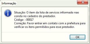 Situação: O item da lista de serviços informado não consta no cadastro do prestador