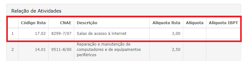 Abaixo um exemplo, se o código da lista for 17.02, o CNAE deverá ser 8299-7/07.