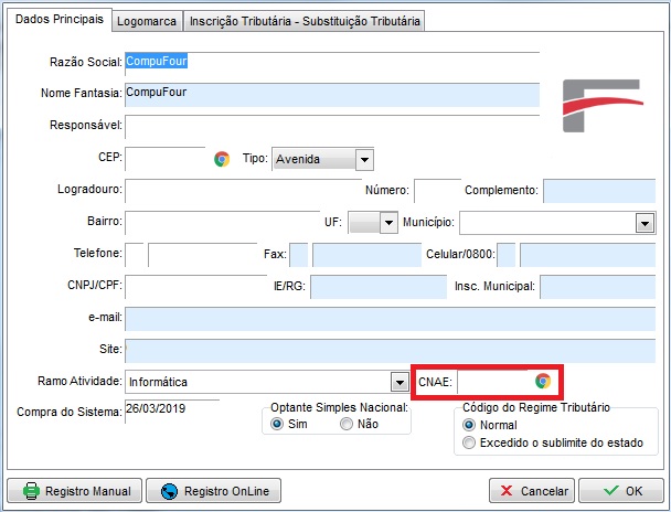 Abrirá a tela do cadastro do emitente, confira ou cadastre corretamente seu CNAE: