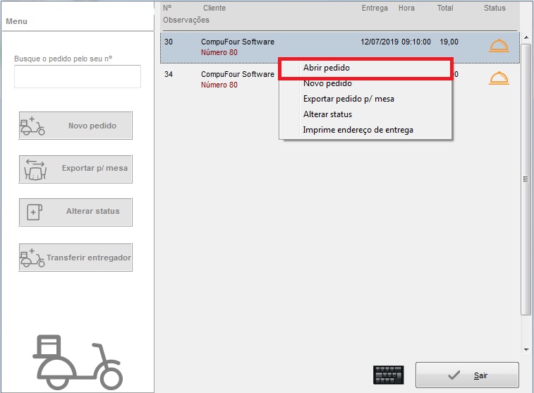 É possível atribuir o pedido ao entregador diretamente por essa tela, clique com o botão direito sobre o mesmo e em seguida clique na opção Abrir Pedidos.