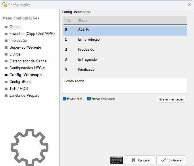 Atrelado a alteração do status do pedido, é possível informar o cliente via WhatsApp ou SMS sobre a alteração do status. Para isso, primeiramente deve ativado o recurso através do Menu Configurações > Config. Whatsapp. Na tela é possível editar uma mensagem padrão para cada status e definir se será enviado SMS ou uma mensagem via WhatsApp:
