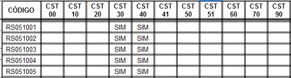 Se utilizado o código RS051001 serão compatíveis os códigos CST 030 e 040, conforme tabela.