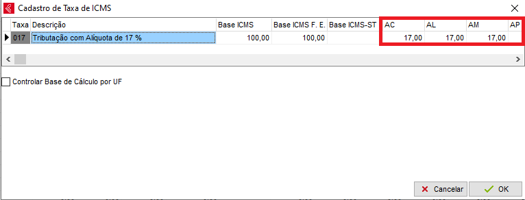Confira e cadastre a alíquota correta em cada UF, poderá então clicar em ok.