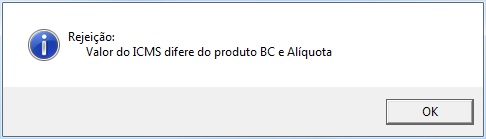 A mensagem ocorre sempre quando os valores são acrescentados diferente do cálculo: "Total produto * Alíquota", a SEFAZ rejeita a nota apresentando a mensagem.