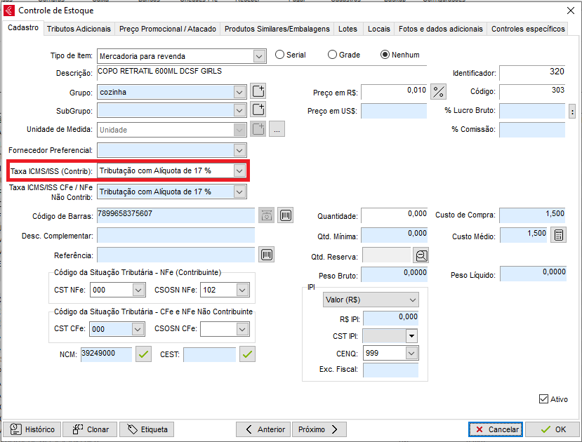 Caso a NF seja novamente rejeitada é necessário conferir as configurações da taxa selecionada no estoque, caso a UF esteja com a alíquota incorreta preenchida, sua nota será novamente rejeitada.