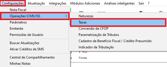 Clique em Configurações - Operações ICMS/ISS - Taxas.