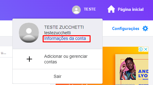 Na tela incial do e-mail clique sobre o nome da conta e vá em informações da conta;