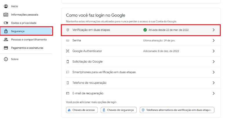 Posteriormente localize a opção Verificação em duas etapas e caso não esteja ativada, ative esta opção.