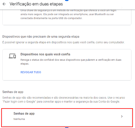 Após ativar a verificação em duas etapas, desça até o final da página e localize a opção Senhas de app: