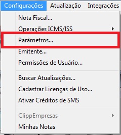 Primeiramente é necessário acessar o menu de Configurações, clicando em Configurações - Parâmetros.