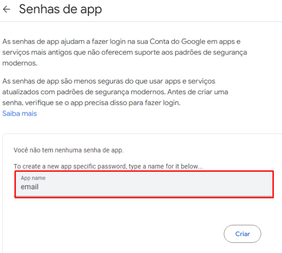 Insira um nome para a sua senha de app, sugerimos que deixe apenas como e-mail, caso utilize outras senhas de app, coloque especificado que esta será para o ClippPRO.