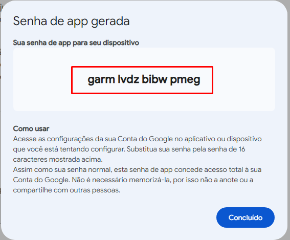Em seguida, será exibido em sua tela uma senha com 16 caracteres, a mesma deve ser utilizada nas configurações no seu ClippPRO para que o Gmail seja devidamente configurado como gerenciador padrão de envio de emails.