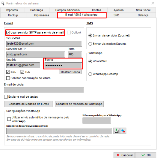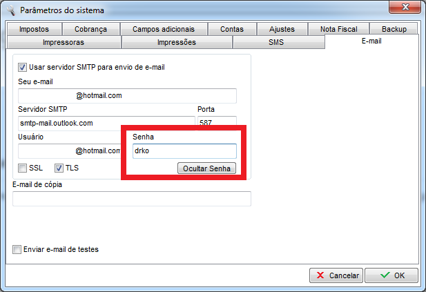 Copie a senha gerada e insira a mesma no campo senha na aba de e-mail dentro dos parâmetros do sistema.