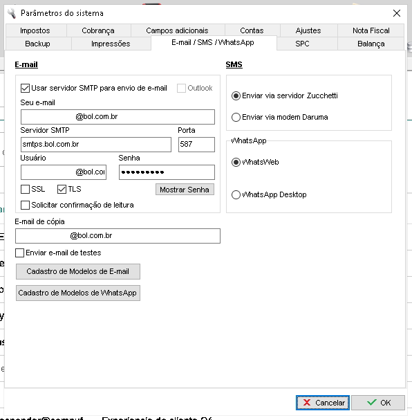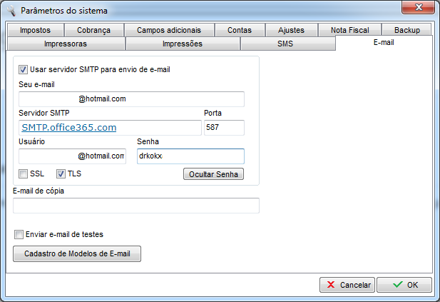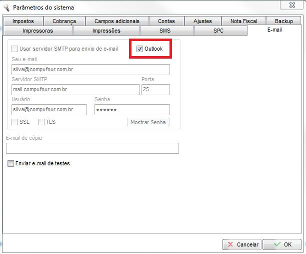 Marque a opção Usar servidor SMTP para envio de e-mail.