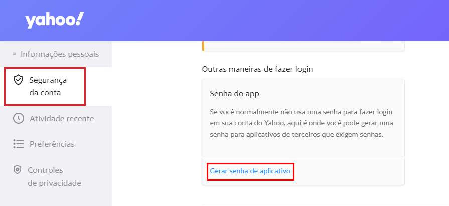 O provedor Yahoo solicita a criação de uma senha de APP, para que seja gerada basta seguir os procedimentos descritos abaixo: