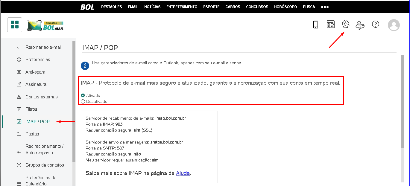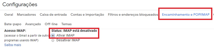 Agora, clique na aba Encaminhamento e POP/IMAP e marque Ativar IMAP.