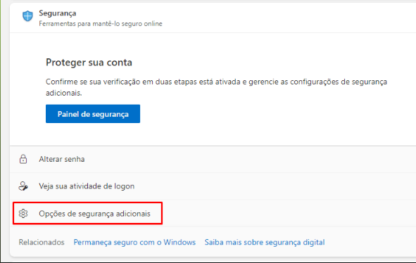 Desça até a aba segurança e clique nas Opções de segurança adicionais.