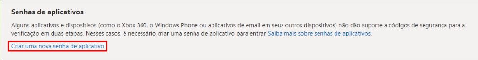 Encontre a aba, Senhas de aplicativos e clique em Criar uma nova senha de aplicativo.