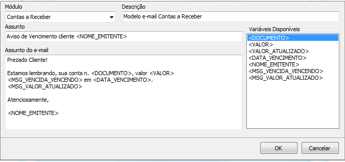 Atualmente só é possível personalizar o modelo para o Contas a Receber, você pode editar o Assunto, mas nunca altere o que está escrito nos campos " < > "