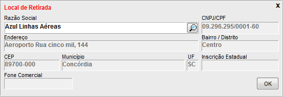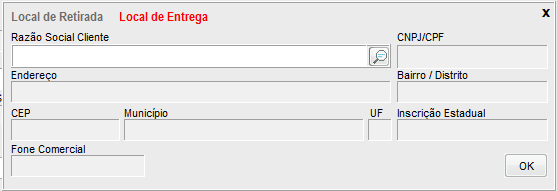 Será aberta a tela onde poderá lançar o Local da Retirada, cadastrado previamente como Fornecedor no Clipp: