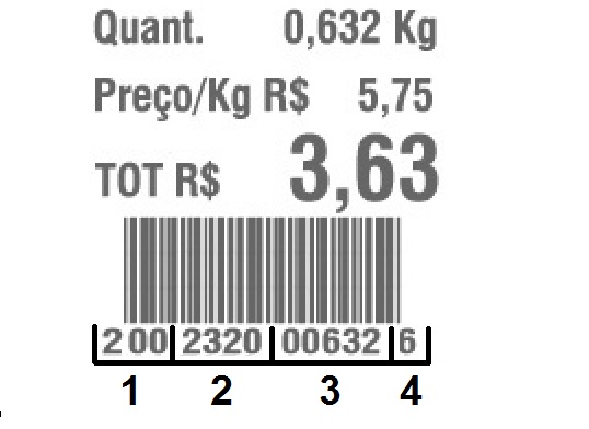 1 - Composição do código de barras da mercadoria, cadastrado automaticamente no campo código de barras. Para saber como cadastrar os códigos dos produtos pesadosclique aqui. 2 - Código identificador do produto no estoque, é o código que o Clipp gera automaticamente ao cadastrar cada mercadoria. 3 - Peso da mercadoria gerado pela balança. 4 - Dígito verificador gerado pela balança.
