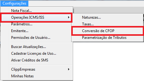 Para cadastrar a conversão de CFOP, acesse o ClippPro e clique em Configurações - Operações ICMS/ISS - Conversão de CFOP: