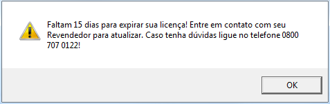 Em ambos os tipos de licença, Para o ECF apresenta a messagem ao abrir o sistema: Faltam15 dias para expirar sua licença! Entre em contato com seu Revendedor para atualizar. Caso tenha dúvidas ligue no telefone 0800 707 0122!
