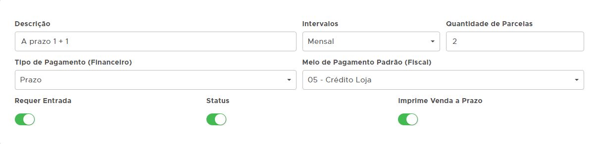 • Requer entrada: Defina se para este parcelamento, é necessário dar uma entrada.