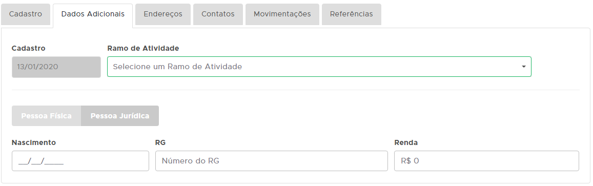 Na aba Cadastro são os dados iniciais do cliente.