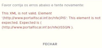 This XML is not valid. Element '{http://www.portalfiscal.inf.br/nfe}PIS': This element is not expected. Expected is ( {http://www.portalfiscal.inf.br/nfe}ISSQN ).