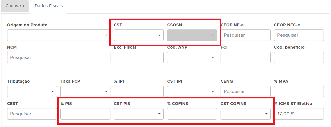 Em seguida, abra o produto em questão e clique na aba Dados Fiscais. Será necessário verificar se estão preenchidos corretamente os campos de CST e CSOSN (CSOSN somente se a empresa for optante do Simples Nacional), além desses campos, é necessário confirmar também se estão preenchidos os campos de %PIS, CST PIS, % COFINS e CST COFINS, caso tenha alguma alíquota de PIS e COFINS informada, o preenchimento do CST PIS e CST COFINS é obrigatório, caso não tenha alíquota de PIS e COFINS, o preenchimento do CST PIS e COFINS não se faz necessário.