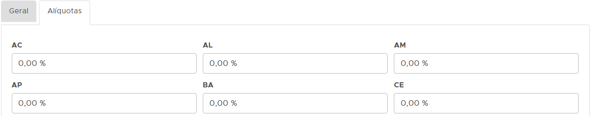 Após cadastrar a aba geral, as alíquotas de cada estado deverão ser preenchidas na aba alíquotas.