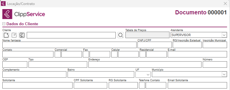 Após acessar o módulo, clique no botão Novo ou vá até o menu Editar e clique na opção Novo para realizar o lançamento da locação. Primeiramente informe os dados do cliente: