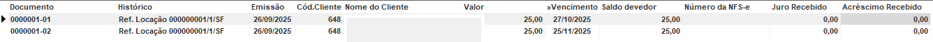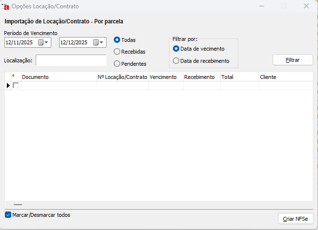 Caso o sistema localize locações com status finalizado e com criação de parcelas (finalização com faturamento diferente de nenhum), irá retornar na tela a relação dessas locações, você poderá utilizar os filtros para localizar qual deseja importar: