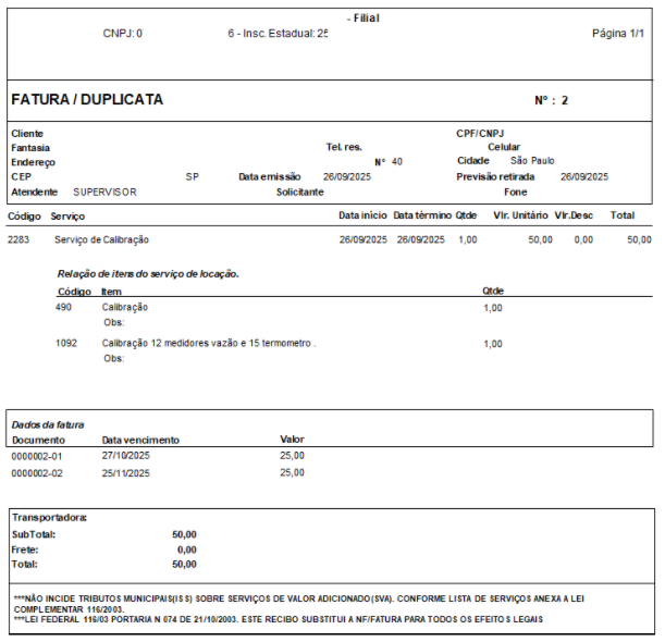 Quando é feita a impressão ou gerado um PDF da locação, as informações serão apresentadas conforme o formato abaixo: