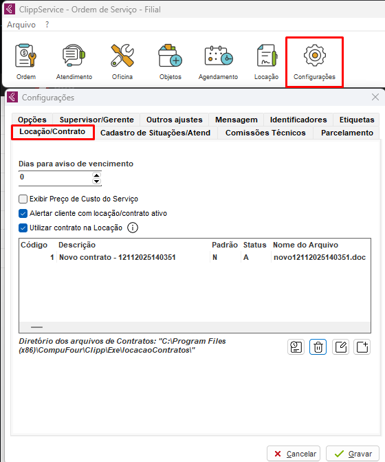 Para configurar o contrato, acesse as Configurações no ClippService > Locação/Contrato