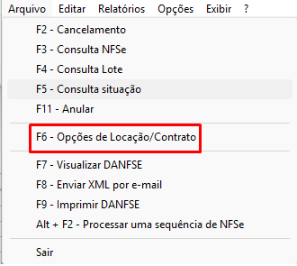 Em seguida, clique no botão Arquivo - F6 Opções de Locação e Contrato;