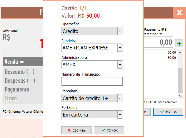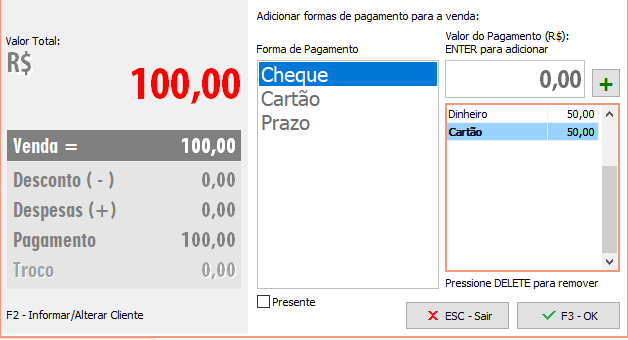 Neste exemplo vamos dividir a saída nas formas de pagamento Dinheiro e Cartão. Por exemplo, selecionamos a forma de pagamento Dinheiro, digitamos o valor de R$50,00 e clicamos no botão "+", para posteriormente selecionarmos a forma de pagamento Cartão e clicarmos novamente no "+" para incluir o restante do valor.