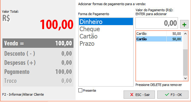 É possível também realizar a saída com mais cartões, para isso, finalize a saída (F3). Na tela de formas de pagamento clique sobre a forma Cartão e no campo Valor do Pagamento (R$) informe o valor recebido no primeiro cartão e clique no botão "+", em seguida clique novamente na forma Cartão, informe novamente o valor e clique no botão "+", e assim sucessivamente para outros cartões. Ao concluir pressione OK (F3) para finalizar.