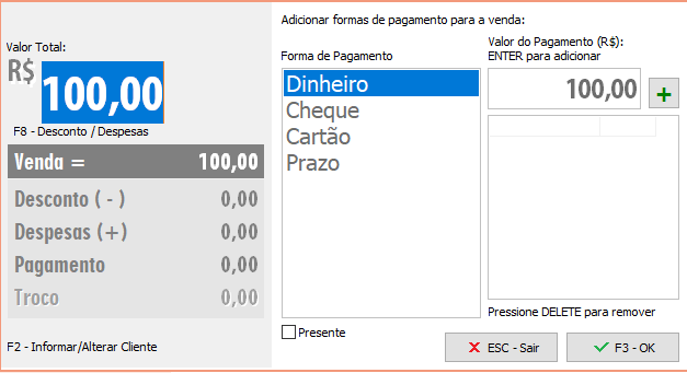 Com a função Presente você poderá efetuar a saída e emitir (além do comprovante com os valores), um outro impresso com as informações de presente, na finalização da saída basta marcar a opção Presente.