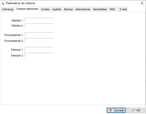 Esta opção possibilita a criação de mais dois campos para os módulos de Clientes, Fornecedores e Estoque. Ao digitar um nome para os campos, automaticamente os mesmos serão apresentados nos cadastros e poderão ser preenchidos com qualquer informação. Estes dois campos também irão aparecer nos relatórios ao exportar os cadastros.