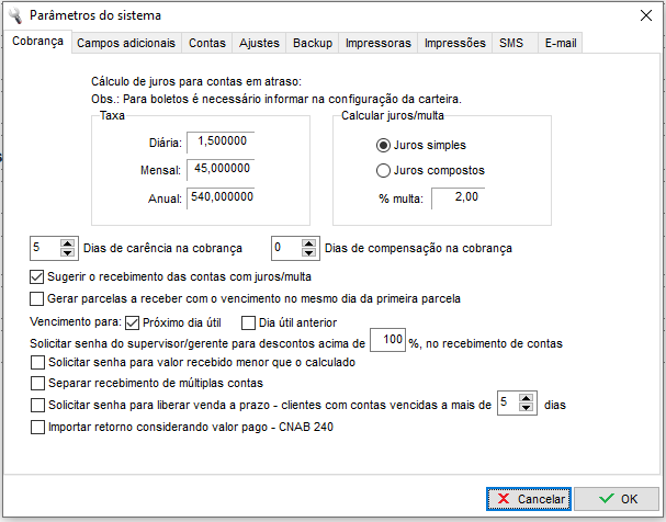 • Dias de carência na cobrança: Essa opção indica ao sistema a quantidade de dias que uma parcela em atraso não sofrerá acréscimo de juros.