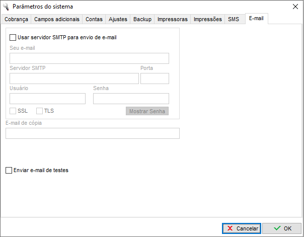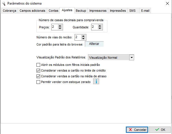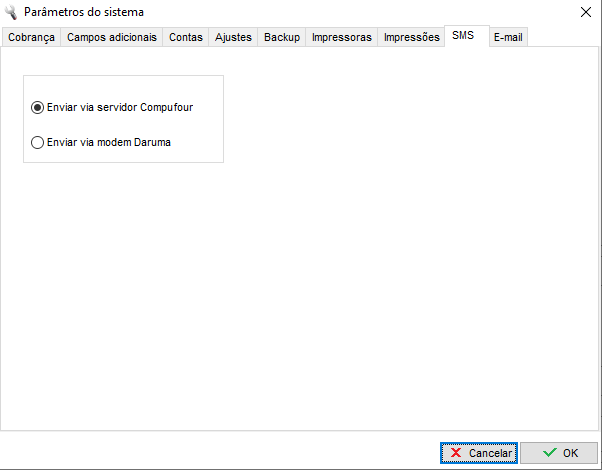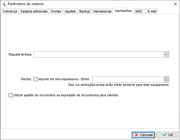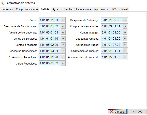 Cobrança                 Campos adicionais                 Contas                 Ajustes                 Backup                 Impressoras                 Impressões                 SMS                 E-mail