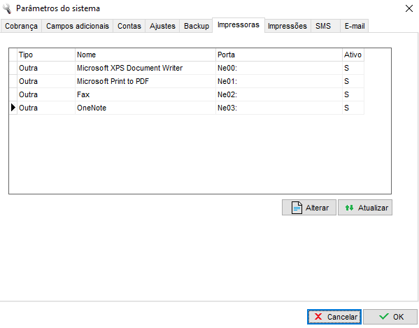 Nesse local serão informadas as impressoras instalados no computador, sendo que será necessário configurar o tipo de cada umas das mesmas. Para configurar o modelo da impressora, dê um duplo clique sobre a mesma ou selecione a mesma e clique no botão Alterar.